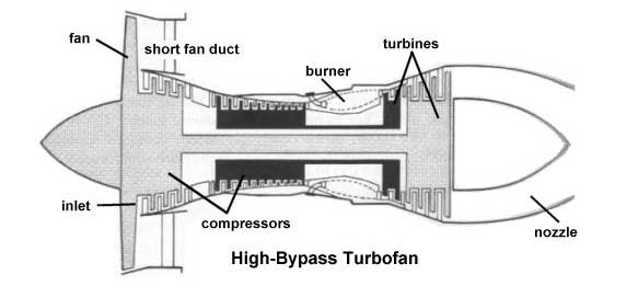 Turbine N2 and N1 inner shaft drives large front n1 fan blades for bypass air. Blow