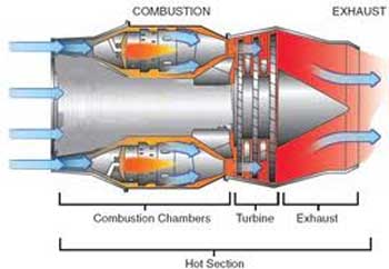 The turbine, made of a number of fan-like blades, rotates as the heated gas rushes past it. The rotating turbine is connected to a shaft which spins with the turbine. The shaft runs back through the combustion chamber. towards the front of the engine. The power of the rotating shaft is used to spin other fan blades where the air enters the engine. This section is called the compressor – and it forces the air to gain higher pressure as it is pulled further into the engine towards the combustion chamber. Basically, the higher the pressure, the more air is available to ignite and expand in the combustion chamber, which then creates the engine thrust.